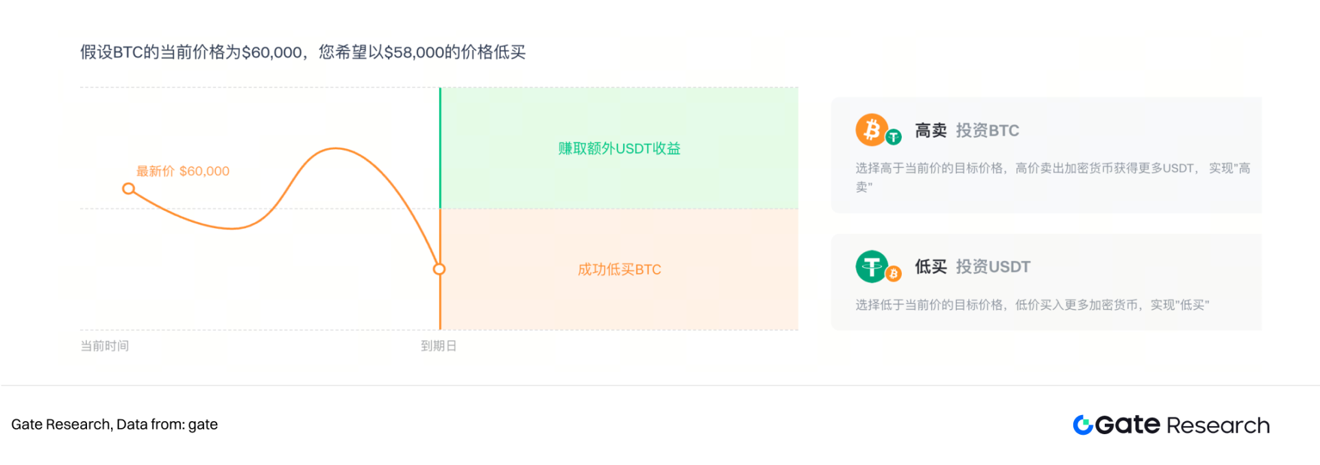 双币投资(Dual Investment)是一种结构化理财产品,其核心逻辑是以持币生息 + 触发条件换币。投资 BTC 的情况下,投资者以 BTC 或 USDT 作为申购币种,在一定期限内获得一笔收益,到期时是否换币,由标的价格与投资者设定的目标价决定。