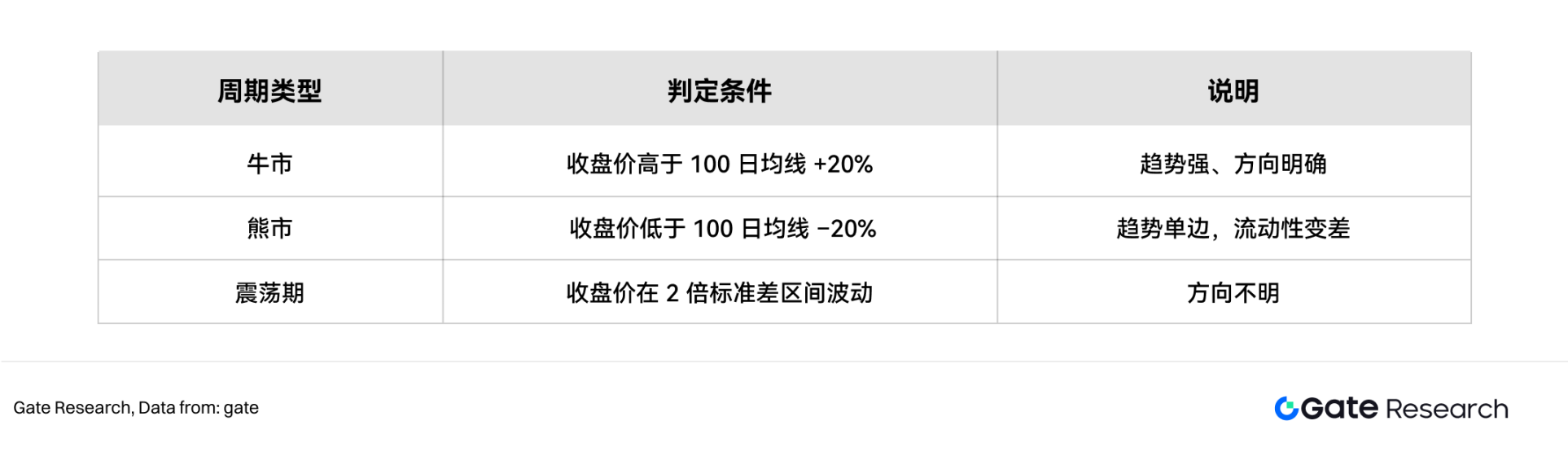 下面将正式进入本篇报告的核心策略部分,本节我们将围绕不同市场周期划分下的双币投资交易逻辑与收益回测结果展开论述。由于双币投资本质上是一种“卖期权”策略,其风险收益特征在不同市场阶段呈现显著差异,因此准确划分市场周期是策略设计的关键前提。