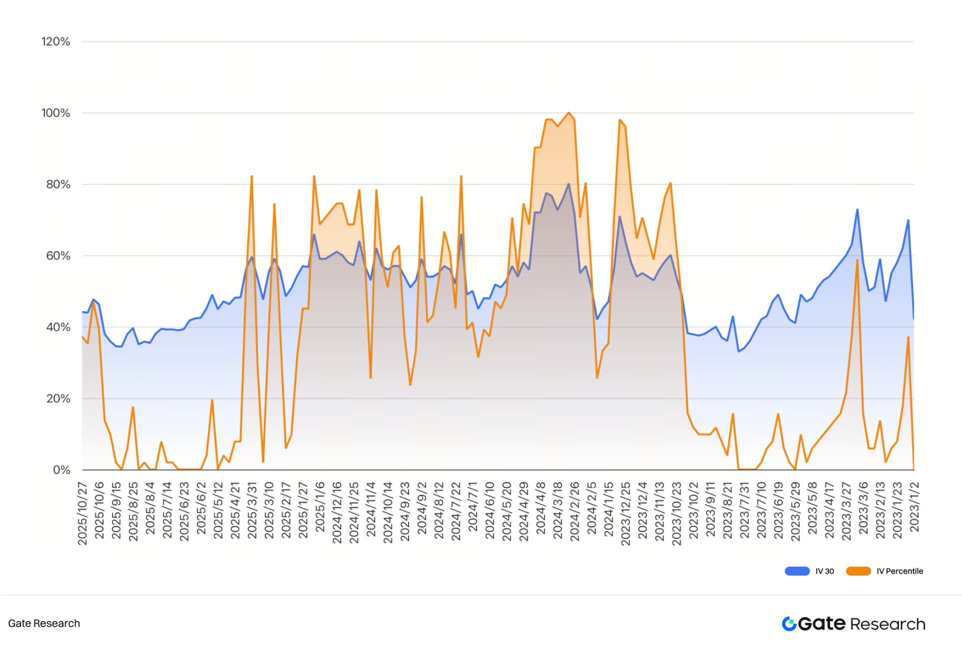 图中可见,黄色的阴影部分为 IV Percentile,蓝线为 IV 30,多数时间 IV Percentile 处于 50% 及以下,> 70% 的日期主要集中于 2024 年牛市期间。