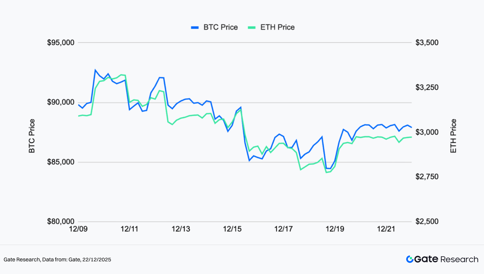据 CoinGecko 数据,12 月 9 日至 12 月 22 日期间,BTC 与 ETH 整体呈现震荡下行后的弱势修复格局,价格重心较前期高点明显下移,市场情绪维持谨慎。BTC 在阶段性冲高后快速回落,随后进入反复震荡走势,多次反弹均受制于上方压力区,未能形成有效的趋势反转,仅表现为低位区间内的技术性修复;ETH 走势与 BTC 高度同步,但下行斜率更为陡峭,在回落过程中多次跌破短线支撑,反弹节奏相对滞后,整体强度略逊于 BTC。【1】【2】【3】