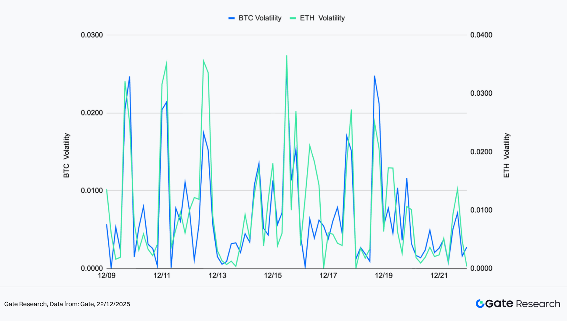 图二:BTC 波动率整体受控、峰值较小;ETH 波动率多次放大,短线情绪反应更为敏感