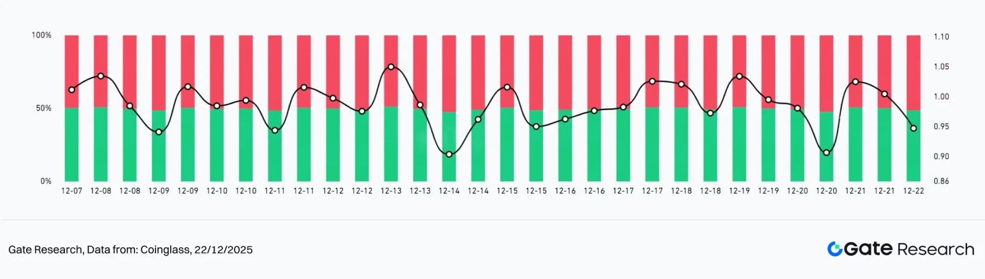 根据 Coinglass 数据,12 月 9 日至 12 月 22 日期间,BTC 与 ETH 的多空比(LSR)整体围绕 1 附近震荡,未出现持续性的单边倾斜,反映杠杆资金仍以短线交易与区间博弈为主,市场尚未形成一致的方向预期。当前 LSR 更体现情绪频繁切换,而非趋势性仓位累积。【5】