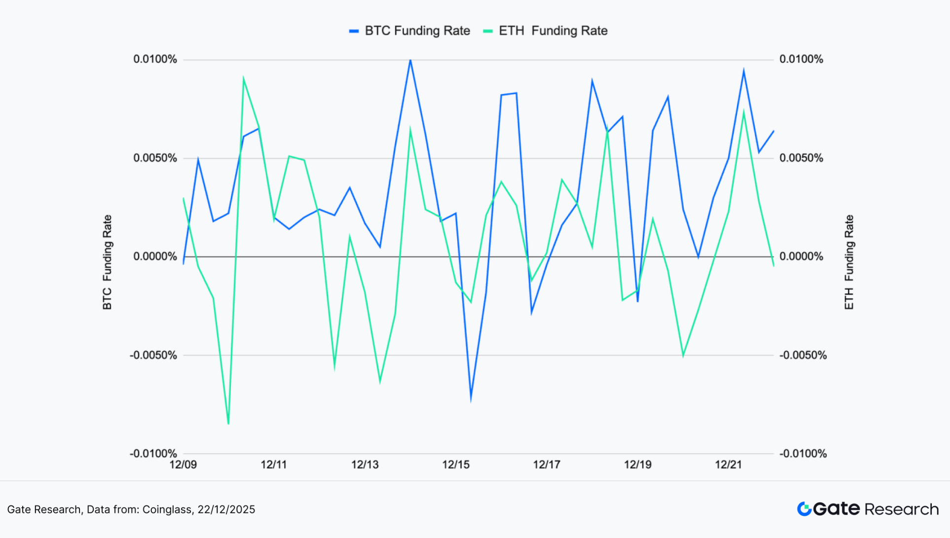 BTC 与 ETH 的资金费率在观察期间整体呈现高频震荡特征,长期围绕 0 轴上下快速切换,显示市场多空情绪反复、方向性共识不足。BTC 资金费率多次出现由正转负、再迅速回升的情形,且单次波动幅度明显放大,反映在价格震荡与回落过程中,杠杆资金持续调整仓位,整体风险偏好偏谨慎。【7】【8】
