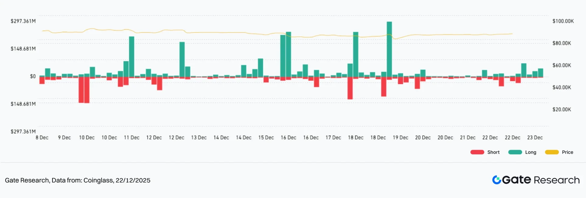 2025 年 12 月 9 日至 12 月 22 日期间,加密市场整体仍处于回调后的弱势震荡阶段,资金参与度与风险偏好同步走低。BTC 与 ETH 价格在高位回落后反复整理,反弹延续性不足,尚未展现趋势性修复迹象;同时,短期波动率多次急升,反映市场对关键价格区间高度敏感,情绪稳定性仍然偏低。多空交易规模比在 1 附近来回摆动,显示主动资金缺乏明确方向;资金费率频繁在正负区间切换,进一步印证杠杆资金以短线调整为主,做多共识尚未建立。
