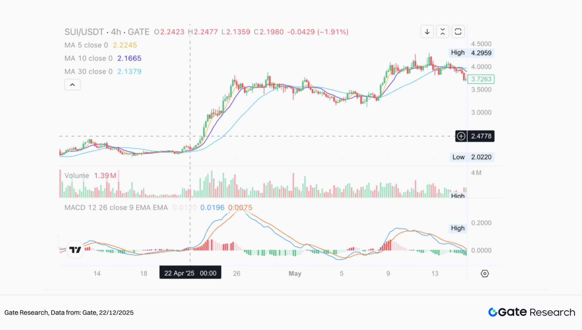 下图为策略在 2025 年 4 月 22 日触发进场时的 SUI/USDT 4 小时 K 线图。可见价格在均线高度密集后向上突破,符合策略设定的进场条件,系统于突破当下价格执行买入操作,成功捕捉后续上涨行情的起点。