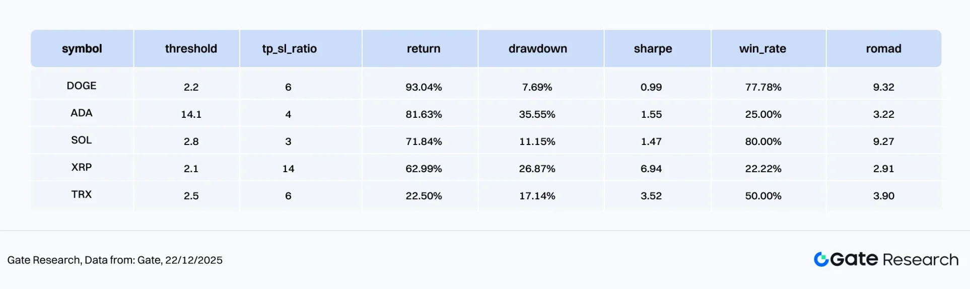在当前震荡偏弱、反弹乏力的市场环境下,均线趋势突破策略仍具备良好的实盘可行性。回测显示,DOGE、ADA 与 SOL 在均线由收敛转为发散后,累计报酬呈现清晰的阶梯式上行;XRP 与 TRX 虽波动较低,但在趋势明确阶段仍能稳定贡献正收益,显示策略在不同波动属性资产上具备一致的趋势捕捉能力。整体收益结构以稳步累积为主,而非依赖单一极端行情。