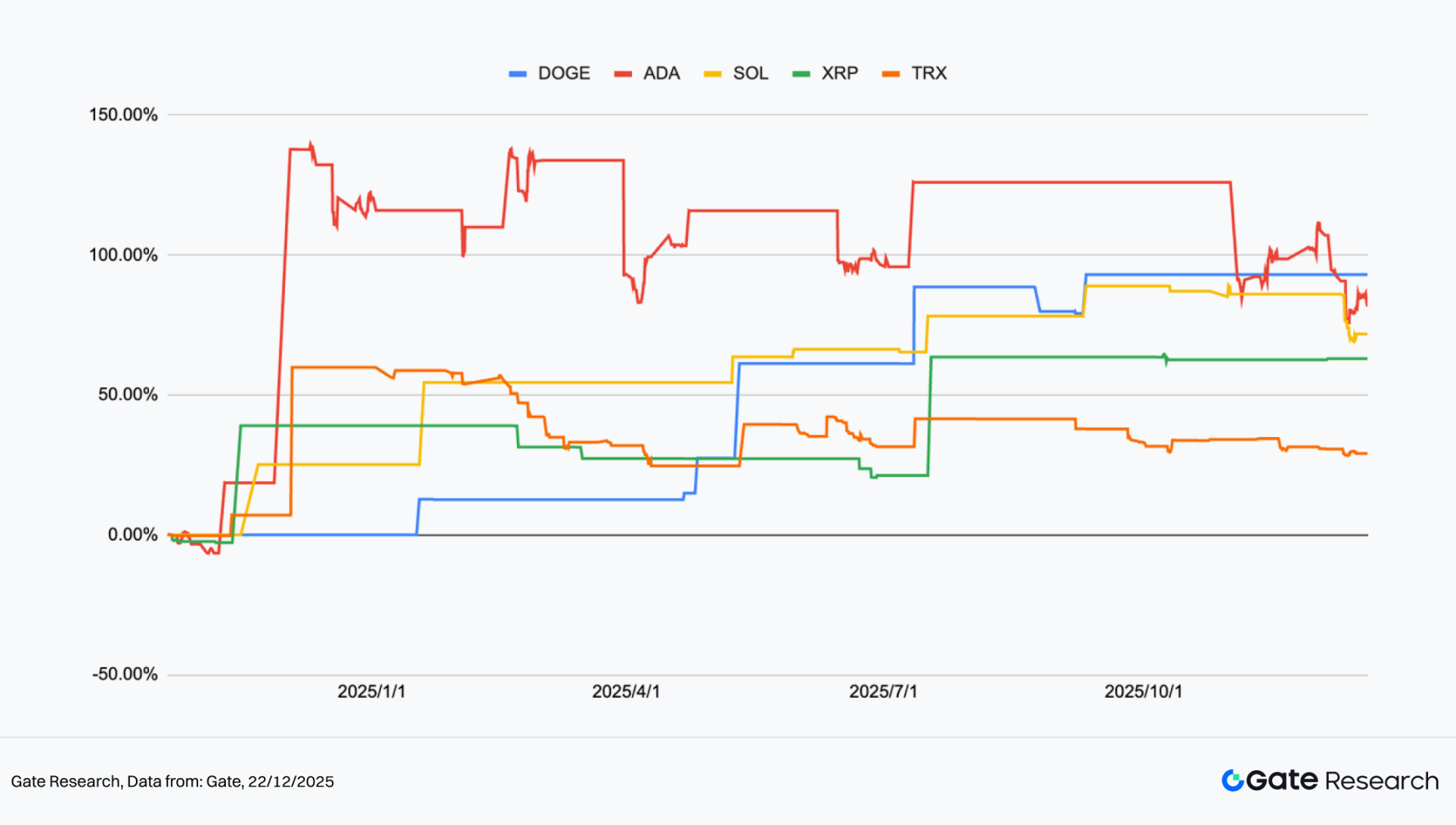 均线密集趋势策略以短中期均线高度收敛后的方向性发散作为核心入场信号,并搭配分段加仓与动态止盈机制,力求在趋势确认后稳定累积收益。从近一年回测结果来看,DOGE、ADA 与 SOL 在多次均线密集后启动趋势行情,累计报酬呈现清晰的阶梯式上行结构,其中 ADA 与 DOGE 的阶段性涨幅一度超过 100%,SOL 亦维持稳健抬升,显示策略在高波动与中等趋势资产中具备良好的趋势跟随能力;相对而言,XRP 与 TRX 的走势更偏区间整理,但在趋势明确阶段仍能贡献稳定正收益,使整体组合报酬保持扩散状态。