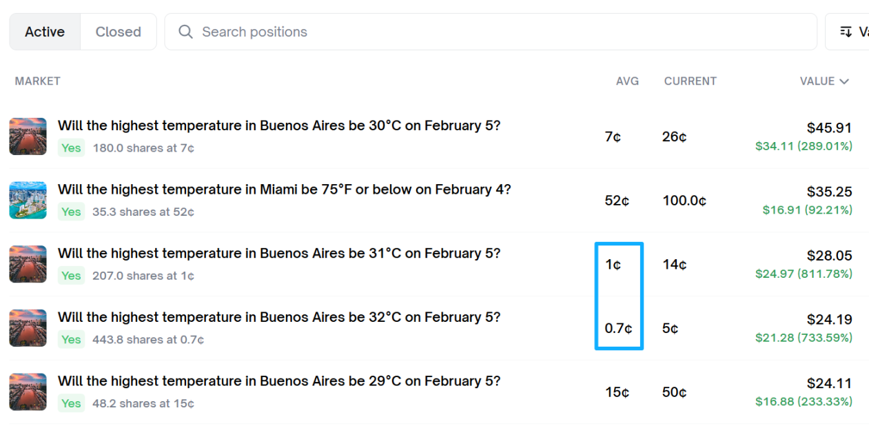 此外,他还擅长捕捉一些极低概率的赚钱机会。他买入的大部分预测市场的单价极低。例如,在布宜诺斯艾利斯 32°C 的头寸上,他的买入均价仅为 0.7¢。这种买入单价意味着他获得了接近 142 倍 的潜在赔率。截图显示该头寸当前已涨至 5¢(涨幅 733%)。