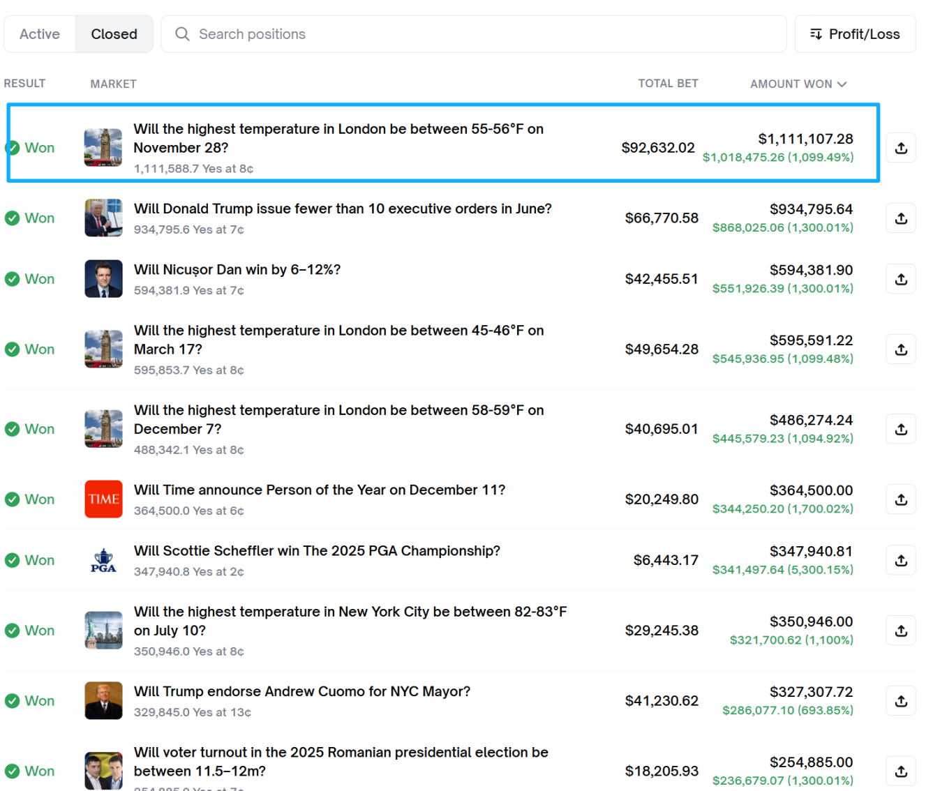观察他的获胜记录,买入价格通常在 2¢ - 8¢ 之间。在预测市场中,这代表市场认为该事件发生的概率仅为 2% - 8%。 普通玩家买 2¢ 的单子可能只投 $10,但 Hans323 敢于在 8¢ 的位置投入 $92,632(伦敦气温单)。
